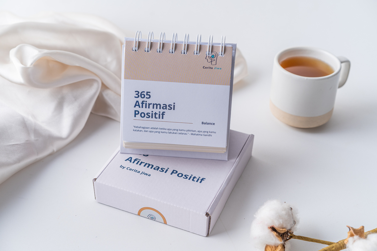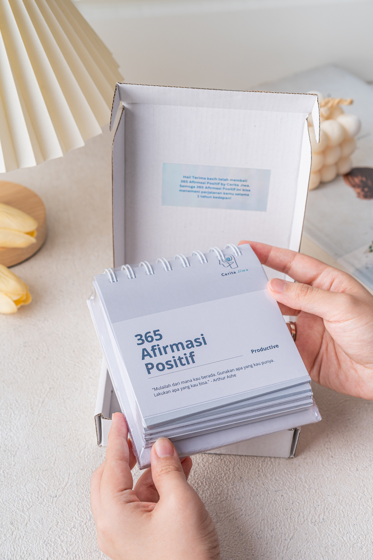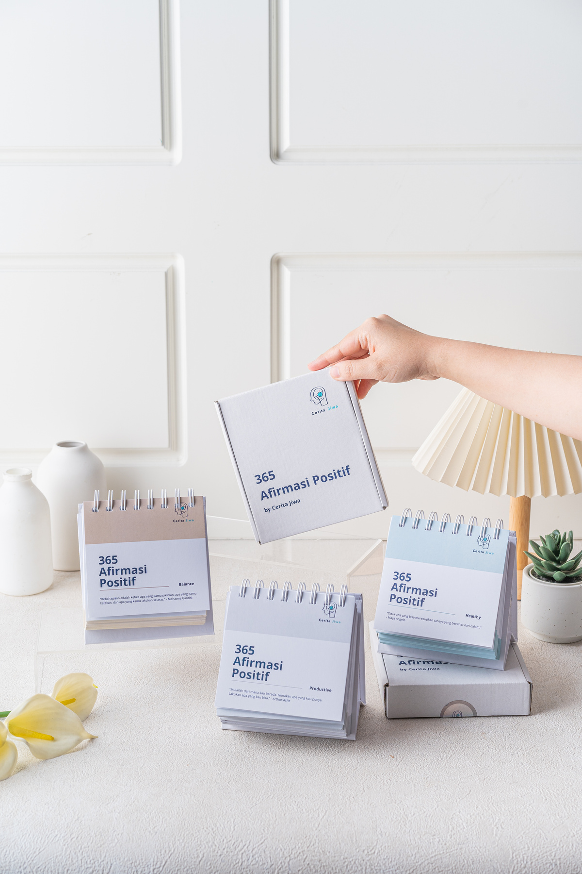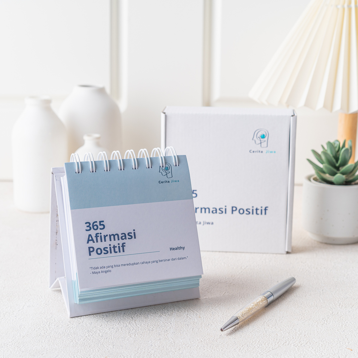 Buku yang berisi 365 Afirmasi Positif dan berbentuk kalender duduk, dengan tema Healthy, Productive, dan Balance